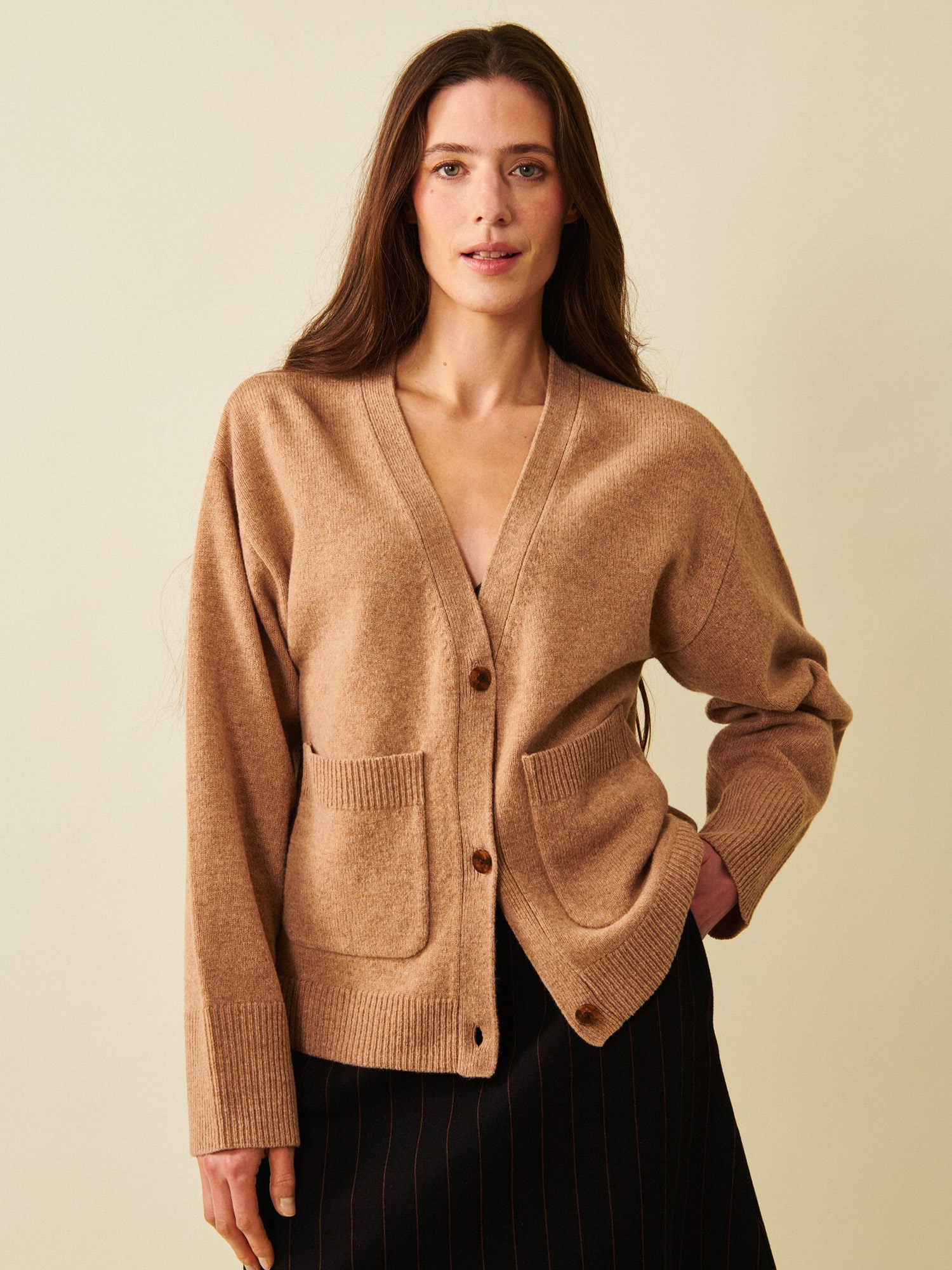 Estrid is a soft and warm cardigan made of 100% merino wool. This feminine v-neck cardigan features decorative front buttons, wide ribbed cuffs, and two practical front pockets — a timeless everyday staple.