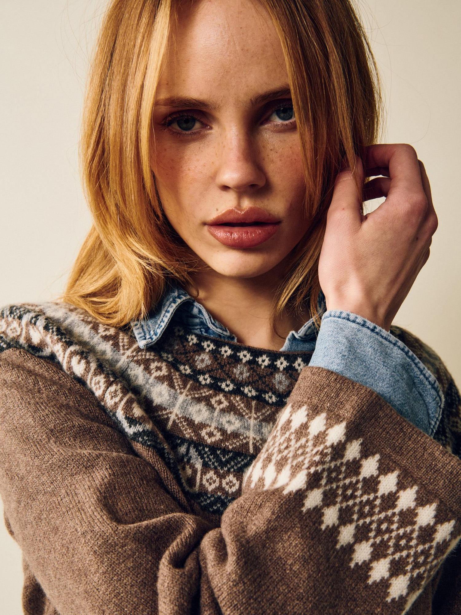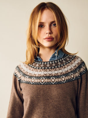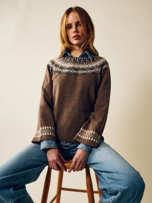 - Patterned knit around neckline and cuffs